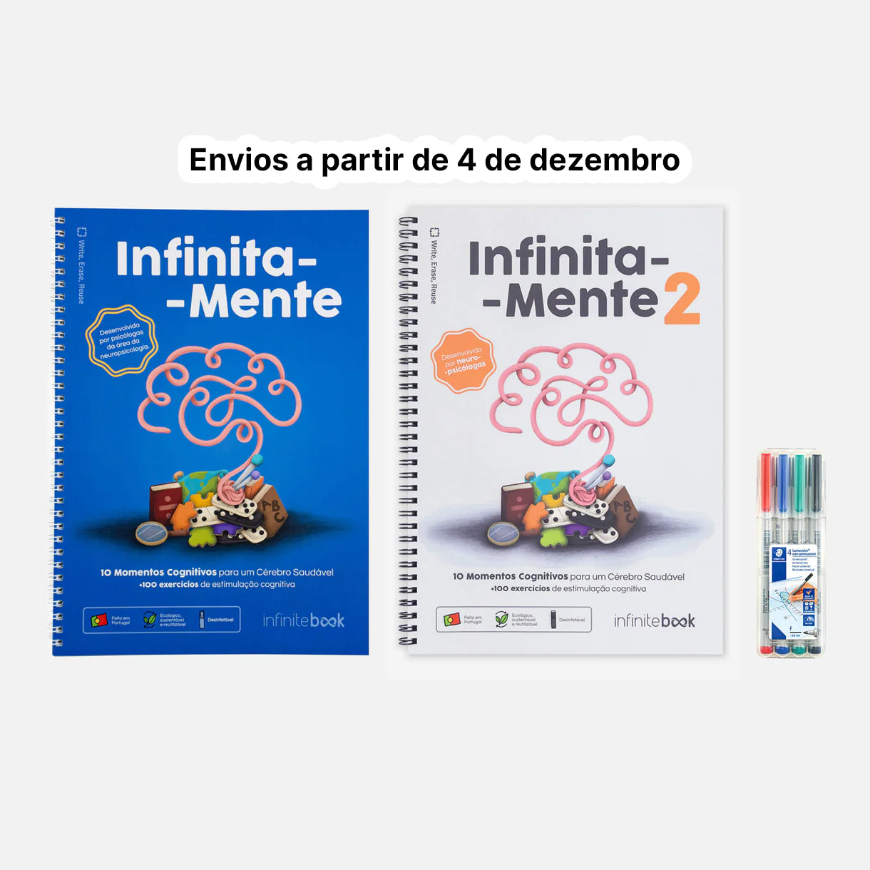 Inclui o InfinitaMente 1 e o InfinitaMente 2 — dois cadernos reutilizáveis de estimulação cognitiva desenvolvidos por neuropsicólogas, criados para exercitar a mente, promover o envelhecimento ativo e manter o cérebro saudável.