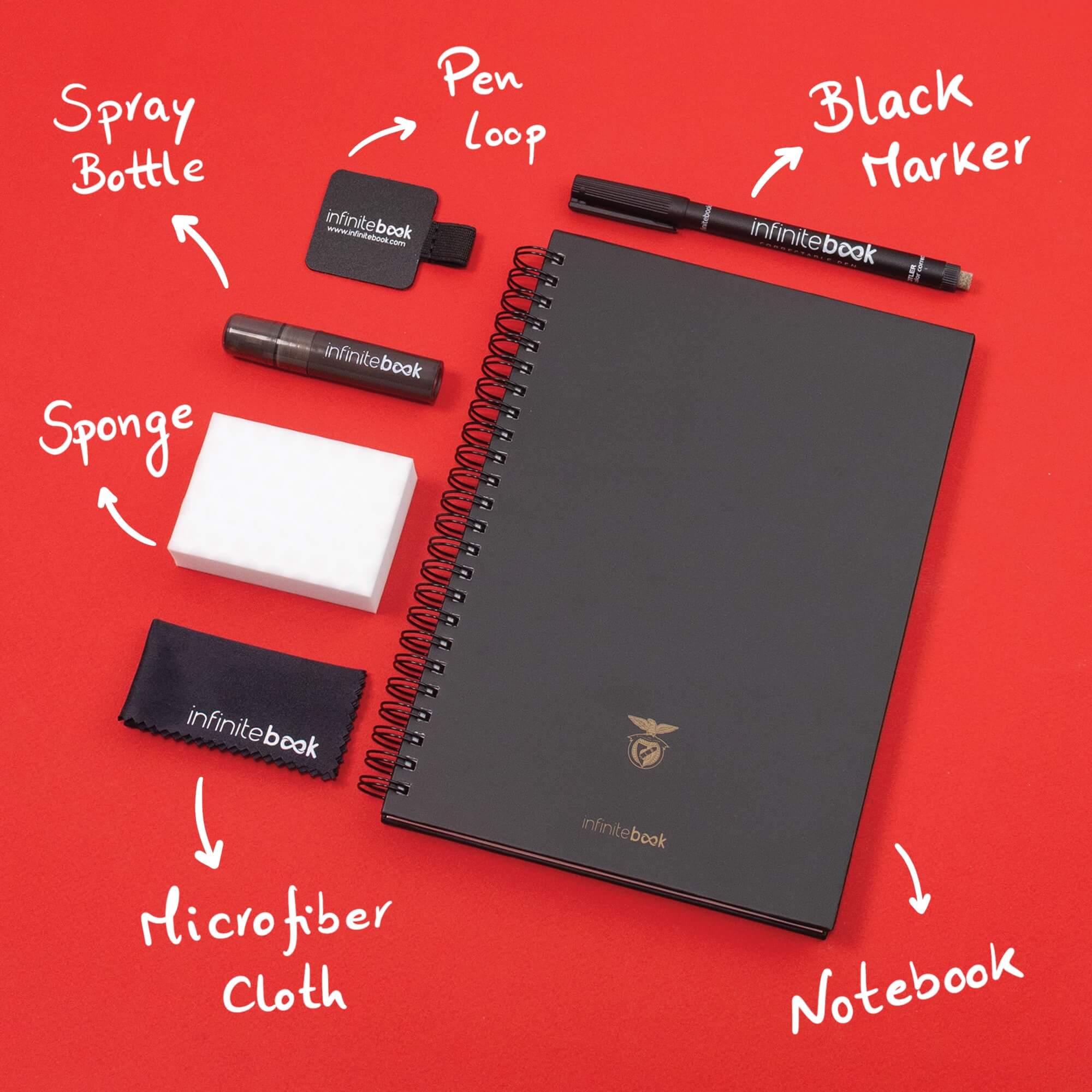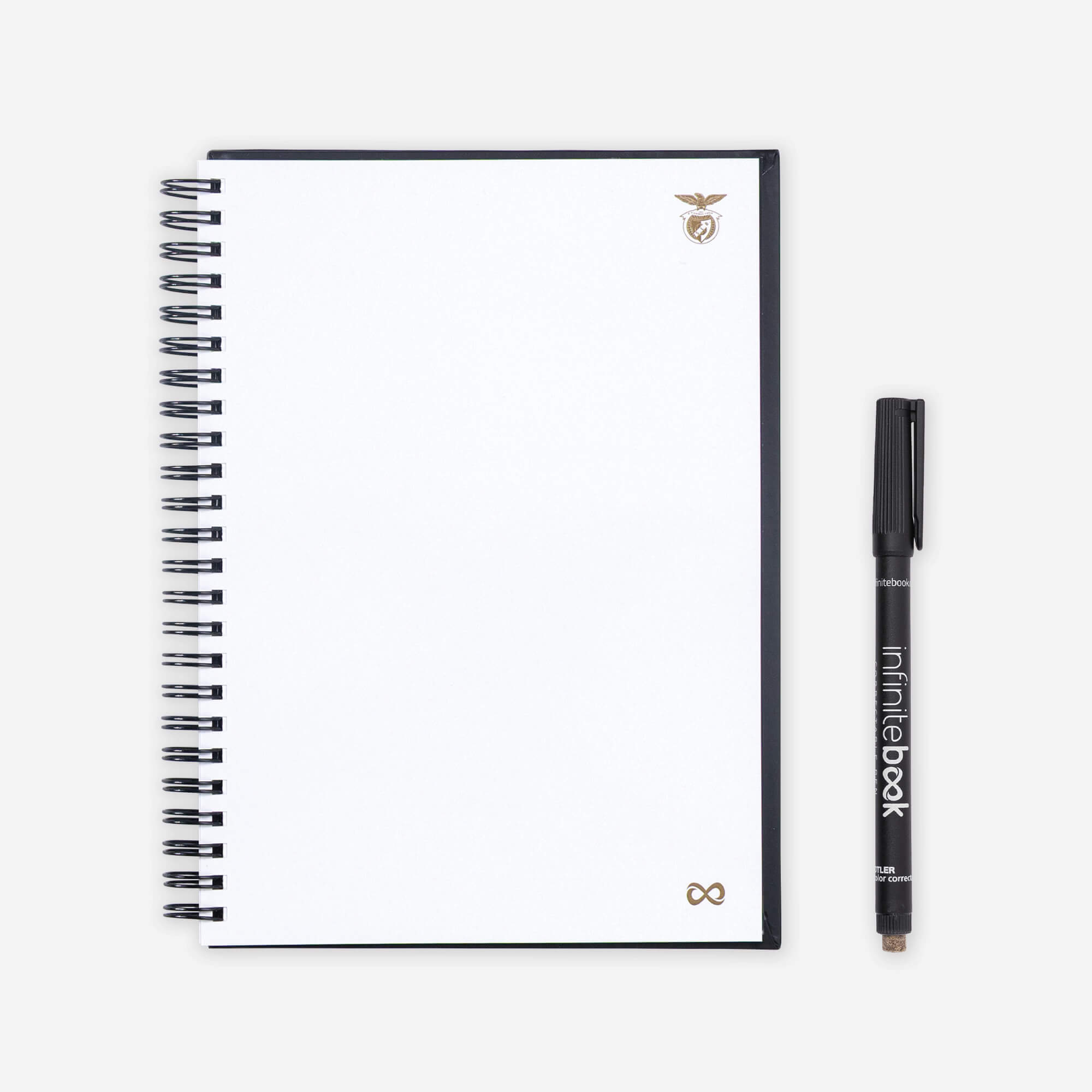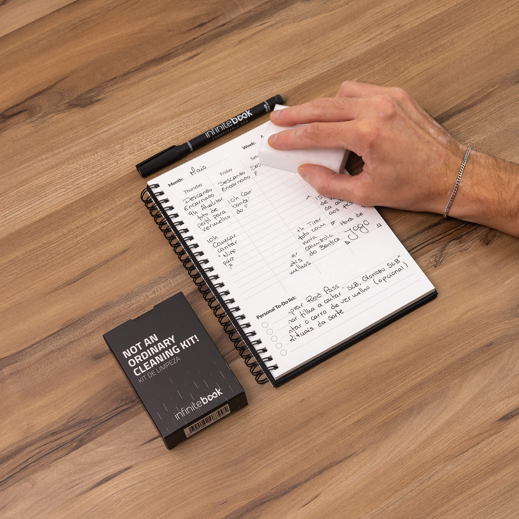 Infinitebook é um caderno reutilizável com a experiência de escrita de um quadro branco. É possível escrever e apagar, reutilizando infinitas vezes o mesmo caderno, daí o Infinitebook. Existem Infinitebooks de diferentes tamanhos e interiores; todos incluem um marcador preto de ponta fina (0,6 mm).
