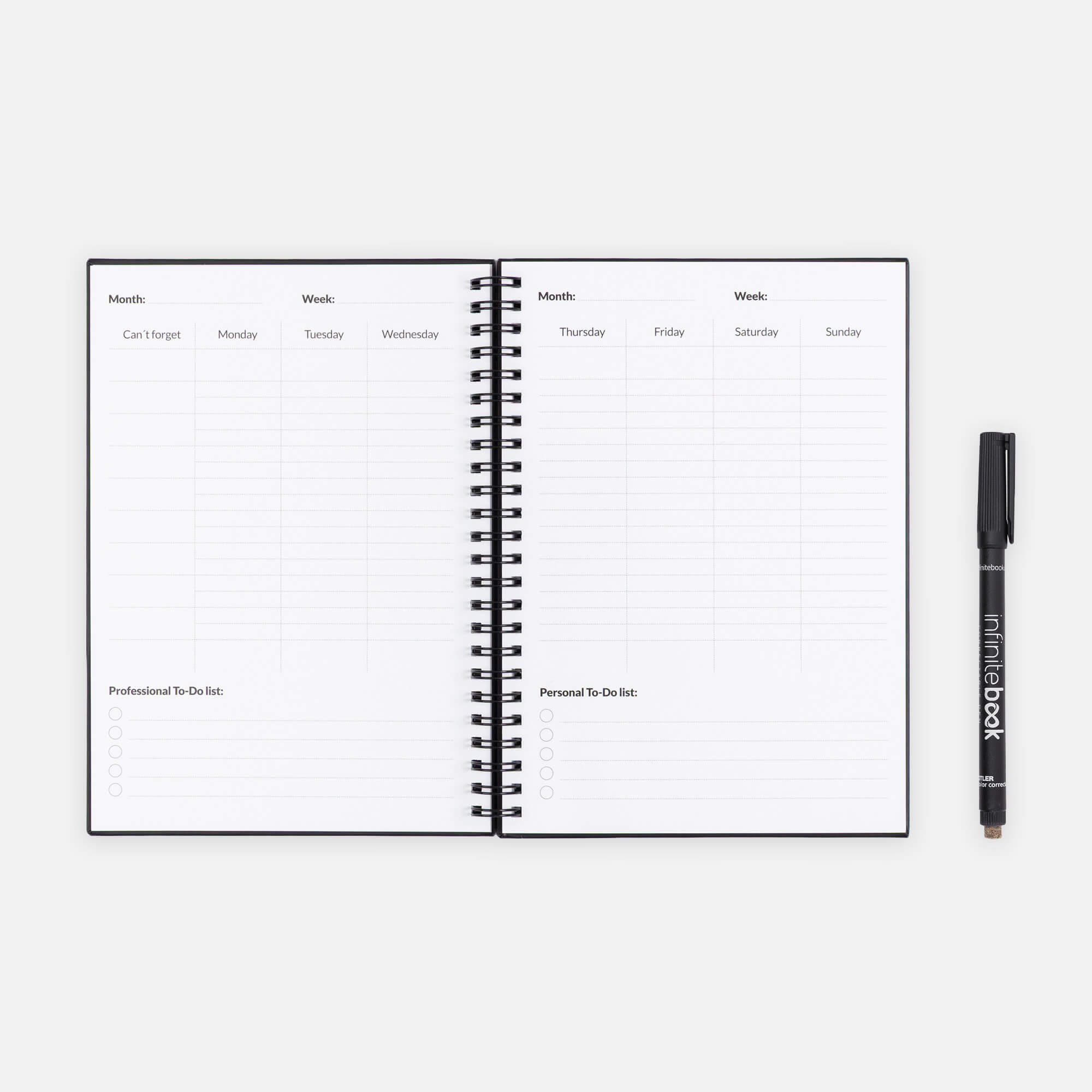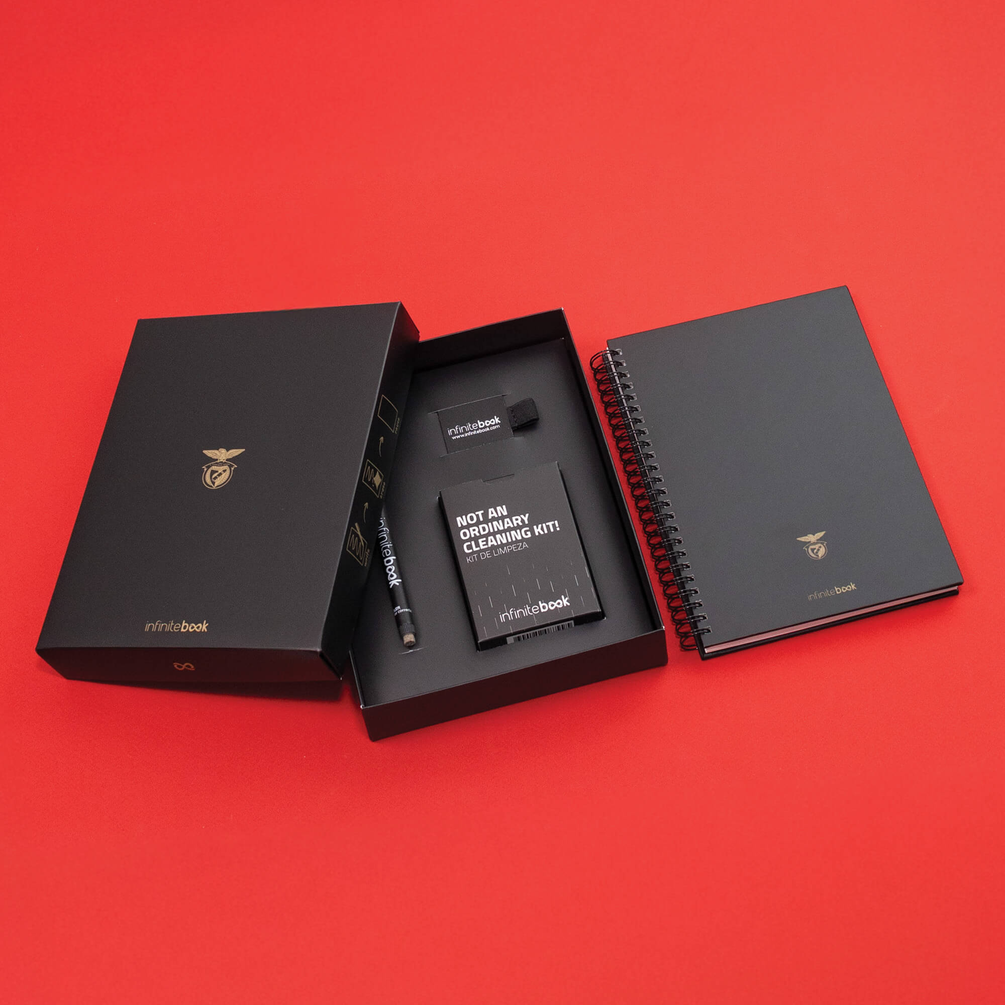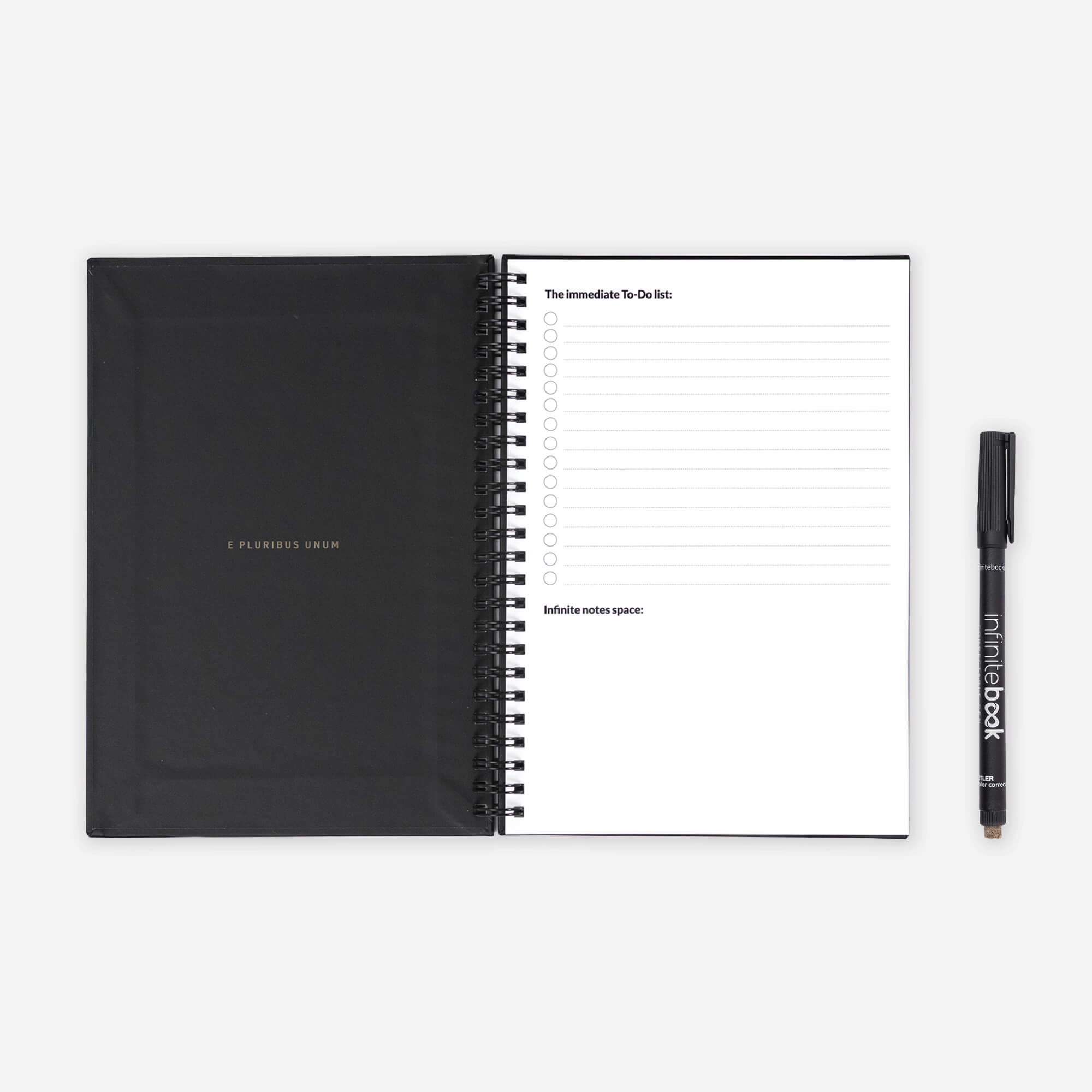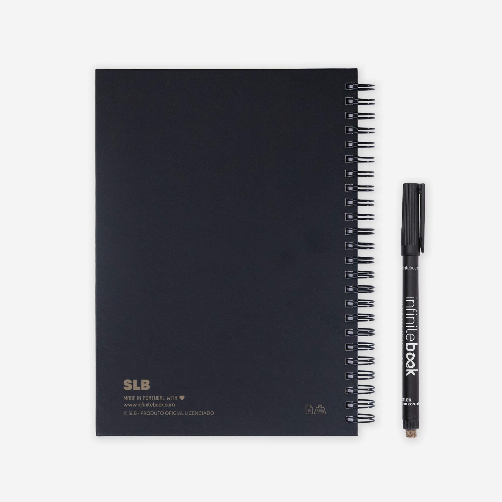 Infinitebook é um caderno reutilizável com a experiência de escrita de um quadro branco. É possível escrever e apagar, reutilizando infinitas vezes o mesmo caderno, daí o Infinitebook. Existem Infinitebooks de diferentes tamanhos e interiores; todos incluem um marcador preto de ponta fina (0,6 mm).